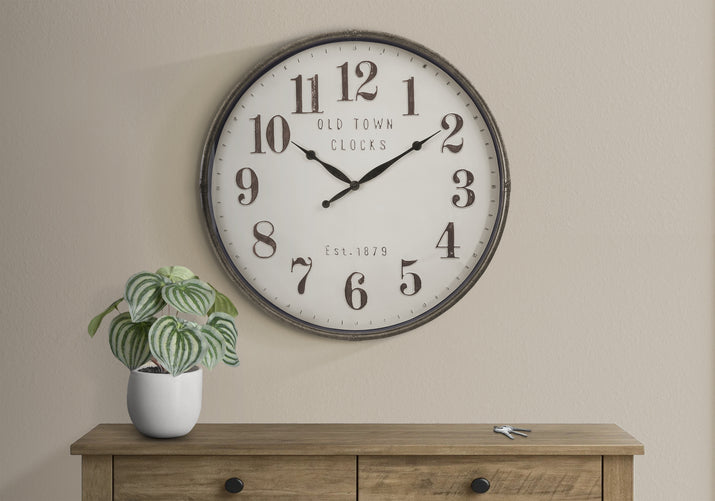 - Trendy and stylish 30' round wall clock in a rich brown finish with a vintage vibe, adding a touch of timeless sophistication to any room with its transitional design.